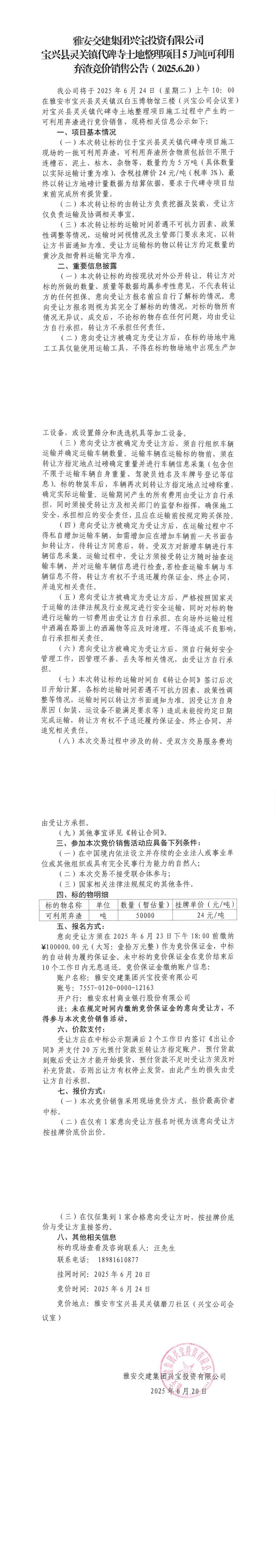 雅安交建集團興寶投資有限公司寶興縣靈關(guān)鎮(zhèn)代碑寺土地整理項目10萬噸可利用棄渣競價銷售公告